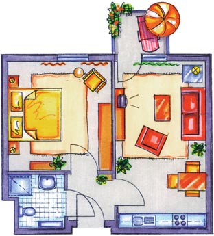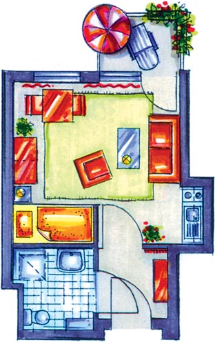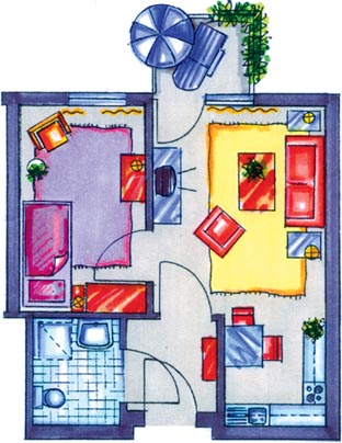 Diese Illustration zeigt das Grundrissbeispiel eines unserer 2-Zimmer-Appartements mit ca. 45 m².